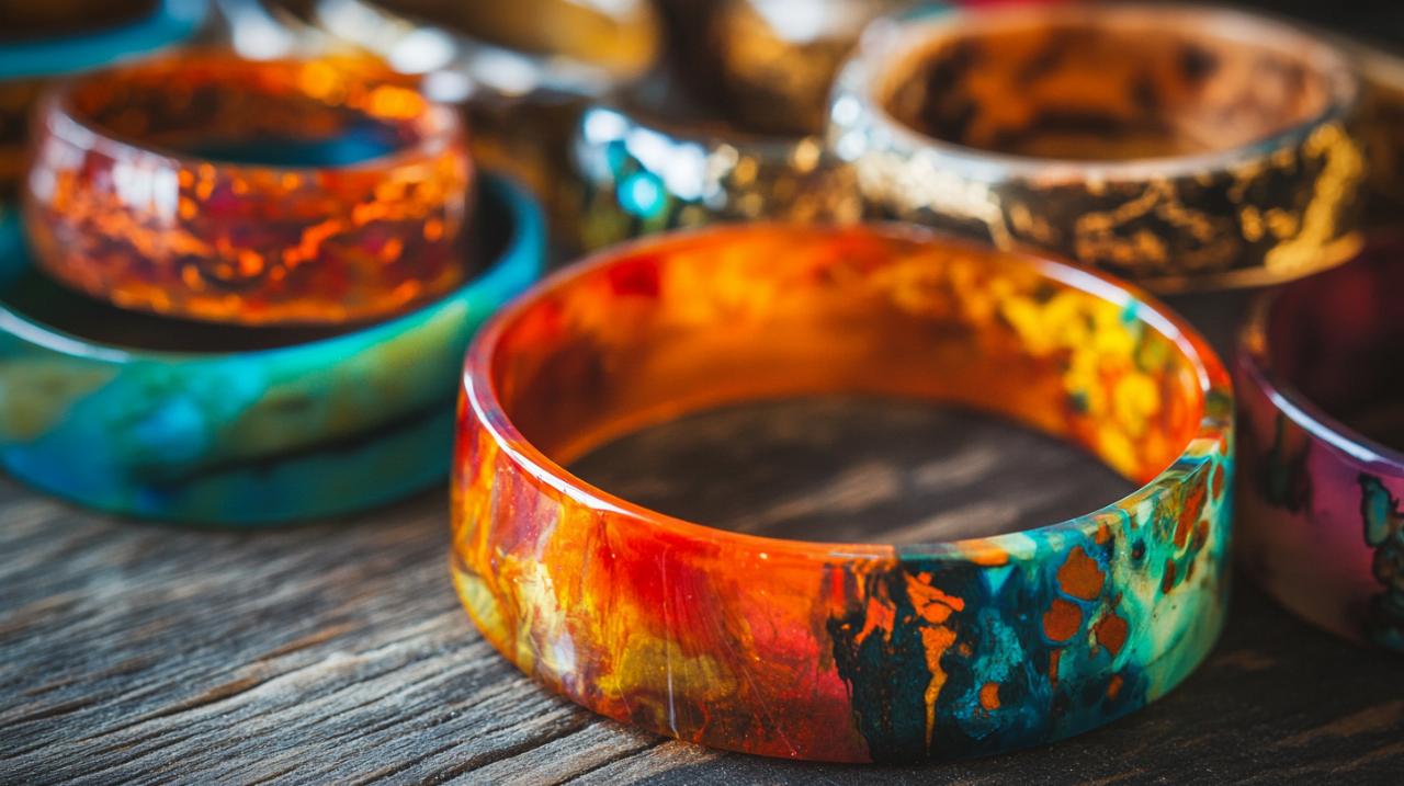 La résine époxy transparente constitue la base de ces créations contemporaines, permettant d'obtenir des effets visuels saisissants impossibles à reproduire avec d'autres matériaux. Les créateurs intègrent des colorants naturels, des pigments soigneusement sélectionnés, et des inclusions variées qui transforment chaque bracelet en une véritable toile d'expression artistique. Cette approche créative explique pourquoi les bijoux en résine rencontrent un tel succès auprès des amateurs de mode qui recherchent des accessoires sortant de l'ordinaire.